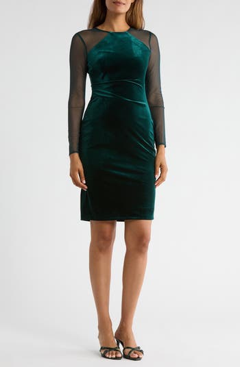 Make an elegant appearance in this ruched velvet body-con dress framed by sheer mesh shoulders and sleeves.