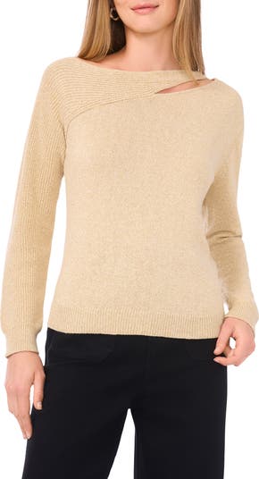 A mix of fine-gauge and chunky-gauge stitches lends dimension to this shimmery sweater featuring an edgy slash at the shoulder.