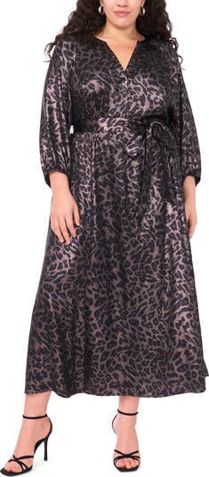 A tie belt defines the waist of this shimmering metallic maxi covered in striking animal spots.