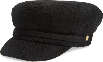 A faux leather strap adds a rich trim to nubby tweed woven cap with a retro-cool sea captain silhouette.