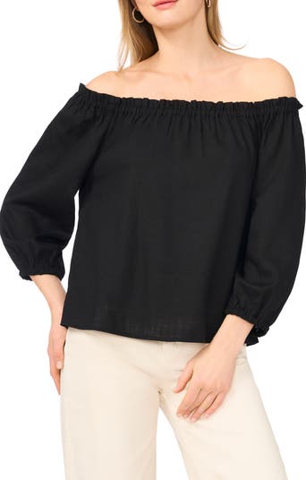 Breezy and beautiful, this linen-enriched top features a flirty off-the-shoulder neckline and three-quarter puff sleeves.