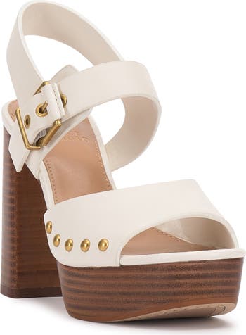 Polished studs and a wood-grain platform sole amplify the retro appeal of a casual sandal topped with smooth leather straps.