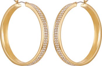 Update your earrings collection with these polished hoops that are gleaming with pavé crystals and warm goldtone plating.
