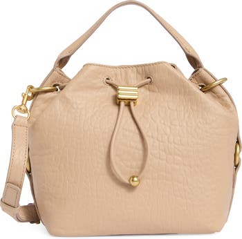 Hardware offers a gleaming finish to a rich leather bucket bag with a drawstring top and an optional crossbody strap for convenient hands-free wear.