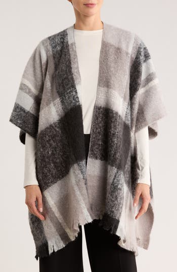 An oversize plaid charms this cozy ruana that adds warmth to any wardrobe for the cold weather season.