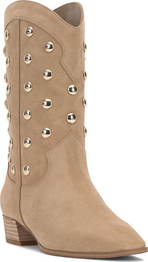 Angular seams and a curved topline add Western-inspired styling to a square-toe boot punctuated by glossy studs and set on a low heel for walkable height.