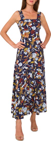 Move gracefully from day to night in this sleeveless printed maxi designed with a shaping smocked back and a draped tiered skirt.