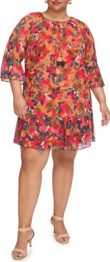 Fluttery ruffles at the sleeves and hem add a fabulous flourish to this chiffon shift dress covered in a painterly print.