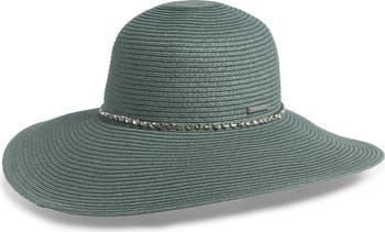 A glistening rhinestone band wraps the crown of this floppy hat crafted from straw.