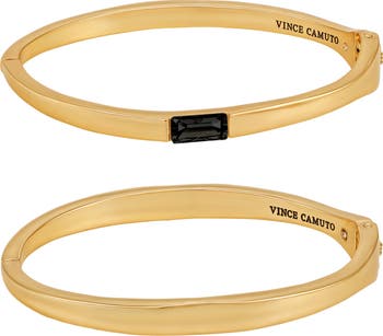 A baguette-cut black crystal brings elegant sparkle to this stackable set of hinged bangle bracelets boasting a high-shine finish.