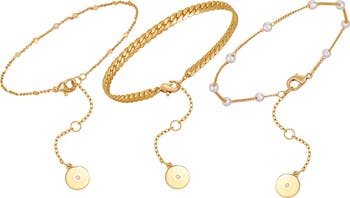 Elevate your everyday wrist stack with this set of warm goldtone bracelets featuring a flat disc, a curb-link and faux-pearl one.