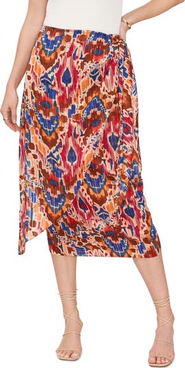 A tie detail creates a faux-wrap silhouette on this shimmering skirt covered in a modern pattern.