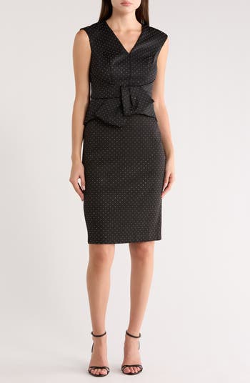 Dainty pin dots bring chic retro style to this sleeveless scuba-knit sheath dress highlighted by an artfully folded peplum.
