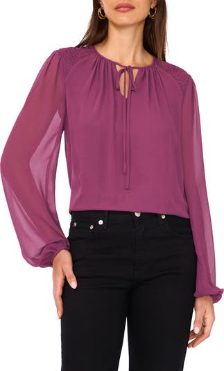 Smocking sweetens the shoulders of a plummy top designed with gently gathered sleeves.