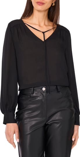 A dainty tie bridges the sophisticated split neck of a fluidly fitting top fashioned from softly crinkled satin.