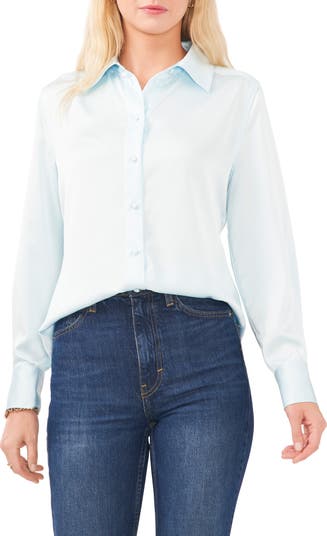 A lightly hued blouse adds dainty covered buttons and a curved hem to bring casual elegance to a standard button-up.