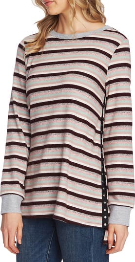Pastel and jaspé stripes cover this easy knit pullover designed with silvery snaps marching down the sides.