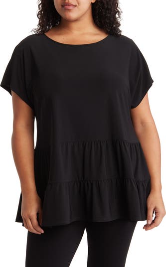 A tiered silhouette adds modern movement to short sleeve top knit from stretch polyester.