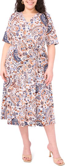 A bold and detailed print animates an A-line midi cut with comfortable stretch and sweetened with a front waist tie.