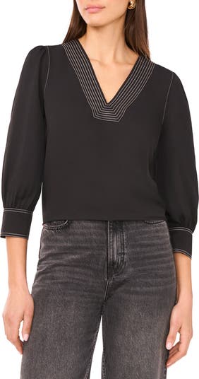 Contrast topstitching highlights the V-neck and cuffs of this wardrobe-staple top cut from a fluid woven fabric.