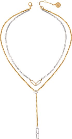 Sparkly crystals highlight the paper clip–links of a trendy layered Y-necklace boasting a polished two-tone finish.