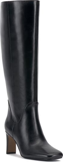 A square toe and slim heel balance a knee-high leather boot fashioned with a side zipper for easy entry.