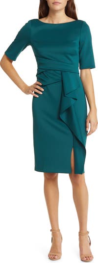 This sophisticated desk-to-dinner dress is designed with a tucked waistline and a luscious ruffle cascading down the skirt.
