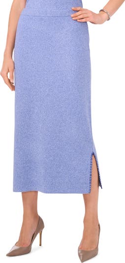 Whipstitched trim highlights the side vents of a classy pencil skirt constructed from a soft, comfortable knit.