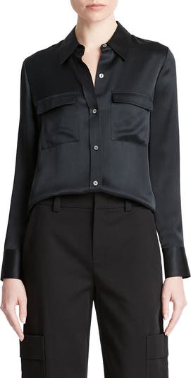 Chest-flap pockets front this polished shirt crafted from rich satin.