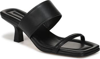A sculptural kitten heel brings walkable lift to this square-toe slide sandal that plays with proportion via wide and narrow straps.