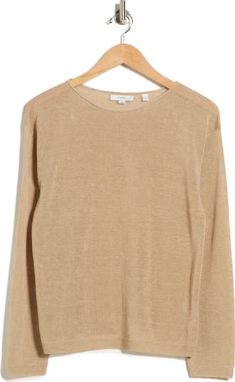A long-sleeve pullover made from a lightweight linen blend nails the chill-weekend vibe with a raw-edge neckline, dropped shoulders and a slouchy fit for easy layering.