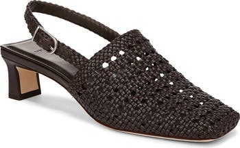 Knotted straps add textural intrigue to a square-toe pump complete with a graceful slingback strap.