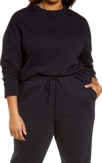 This is a high quality sweatshirt of a medium weight. The optic white is a crisp summer white and makes for a fresh look, but the combo of the boxy shoulders with a shorter length — hits at the top of my waste — is not for me. I’ll be returning.