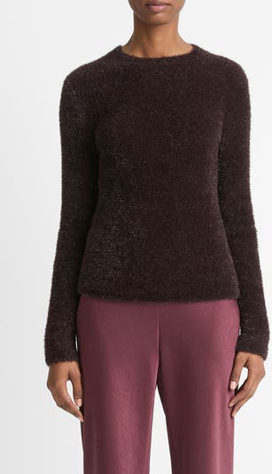 Soft metallic eyelash fringe adds a little shimmer-pop to this cozy sweater with slightly extended sleeves.