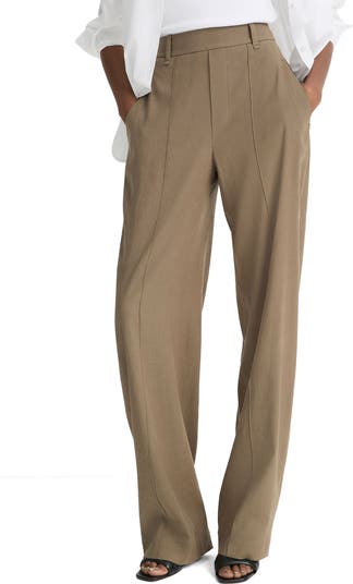 An elastic-eased waist brings discreet comfort to stretchy linen-blend pants that are ready for the workplace with crisp creases and back welt pockets.