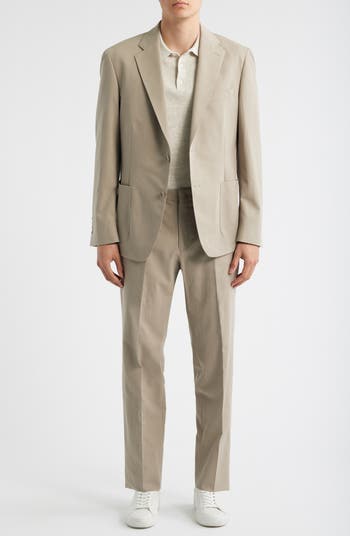 A crisp, breathable cotton blend enhances the easy-wearing comfort of a suit styled in a simple khaki color that takes you from warm-weather occasions to semiformal events with ease. Traditional pick stitching on the lapels pairs with flat-front trousers to bring classic detailing to this versatile wardrobe staple.
