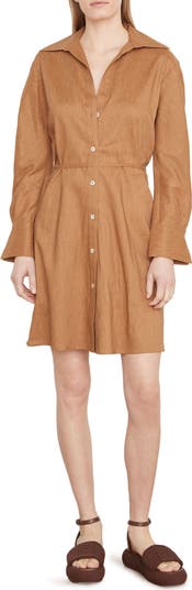 A linen-blend shirtdress softens the look with a relaxed fit, a simple string-tied sash and a slight flare at the sleeve cuffs.