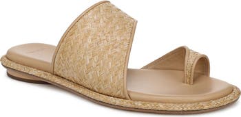 An asymmetric instep strap and toe ring create visual intrigue on a cushioned leather slide sandal rendered in sleek leather for weekend-ready wear.