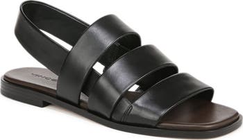 A trio of leather straps stand out over the vamp of a leather slingback sandal set on a cushioned footbed that offers comfortable arch support.
