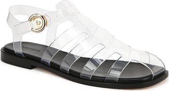 Geometric cutouts create a fisherman-inspired silhouette on a translucent jelly sandal grounded by a cushioned footbed with optimal arch support.