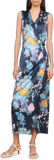 A gracefully draped dress is tumbled with blooms and cut from glossy satin for a look that's ready for summery soirées.