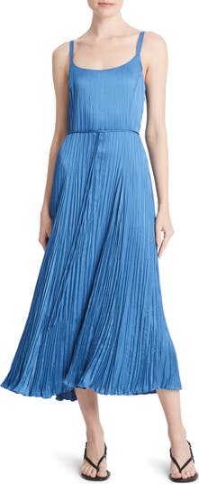 Fashioned from crisply pleated satin, this essential slipdress elevates any evening with a scoop neckline and timeless midi length.