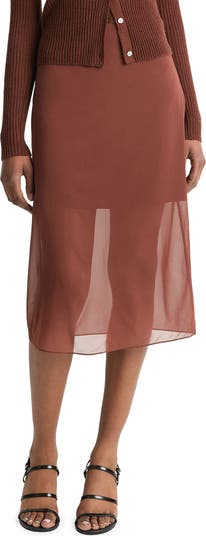 Capture their glance in an alluring pencil skirt cut from stretchy silk with a daring sheer overlay and back slit.