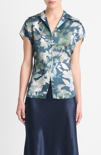 Abbreviated dolman sleeves frame this printed shirt crafted from rich silk.