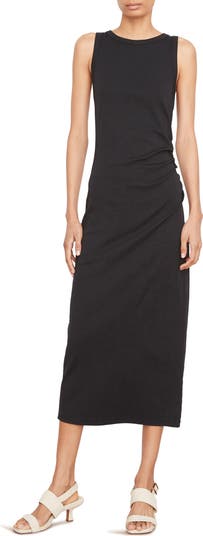 Simple side gathers add soft texture to this midi-length dress cut from stretch-kissed cotton.