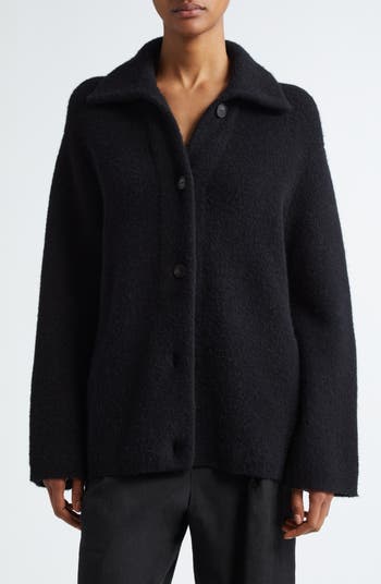 Fuzzy alpaca enhances the cozy comfort of a long button-front cardigan featuring handy side-seam pockets and a spread collar.