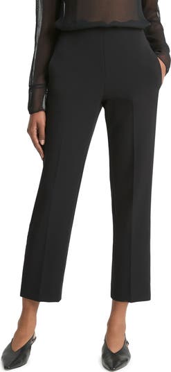 Flat-front pants vie for favorite status with a kicky cropped length, a plush velvet side stripe and the discreet comfort of an elastic back waist.