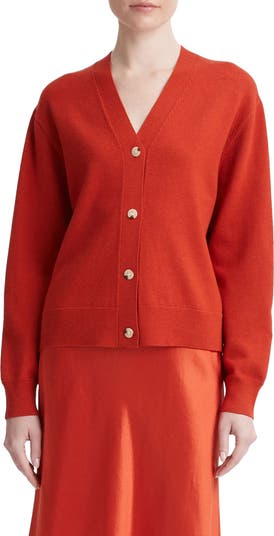 I purchased this Vince cardigan on sale in the color Vermilion. It’s a fairly vibrant red-orange. The knit is smooth, tight, and mid-weight. It’s not a heavy layer but is a roomy fit. I haven’t worn it enough to notice pilling but I hope it doesn’t. It hits mid-hip on my 5’7”, short-bodied frame. I bought a small and the fit is easy.