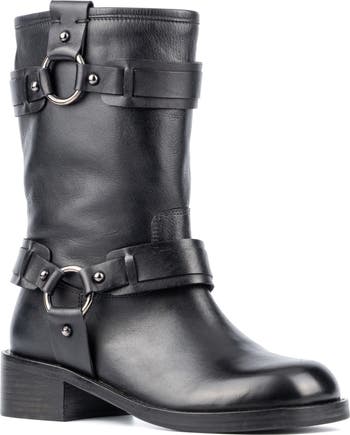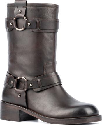 Show off rugged style in a polished leather Western boot grounded by a flexible sole and stacked block heel. Rustic harness buckled-straps add a signature edge to your look.
