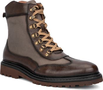 Brassy hardware gives a hiking-inspired look to this hardy but stylish boot enhanced with spray-painted details long the edges.